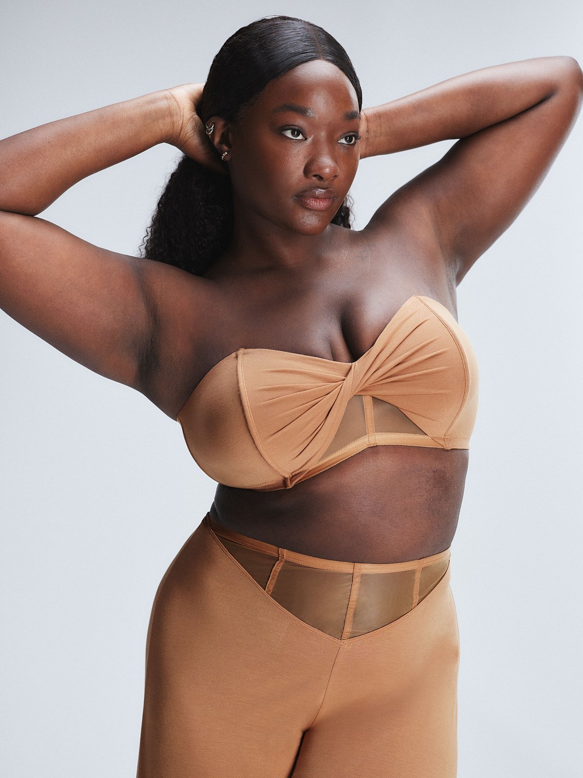 - Keyhole cutout at upper-back body with ruched seam detail