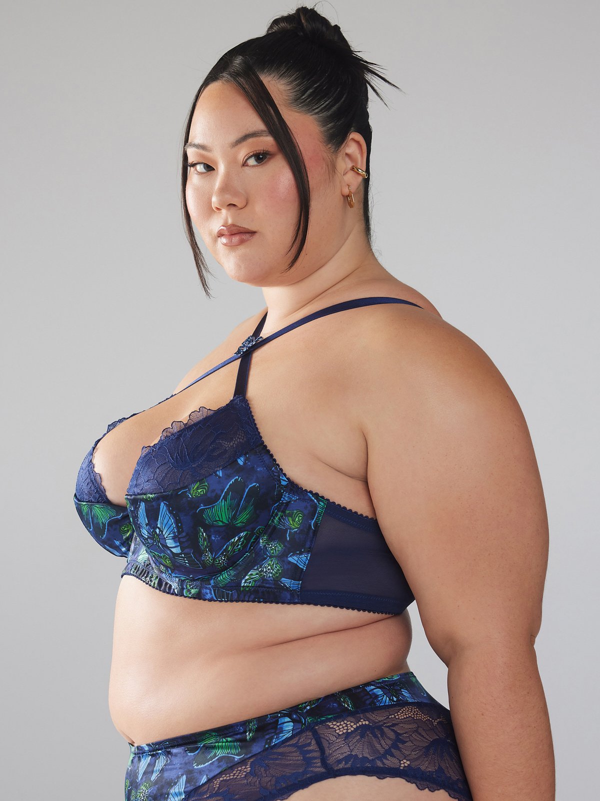 Enter your new element with our Baroque Butterfly Lace Quarter-Cup Bra, featuring a padded quarter cup with an unlined, lace top cup, a satin body, and a halter neckline with adjustable, supportive straps that cross in front and back.