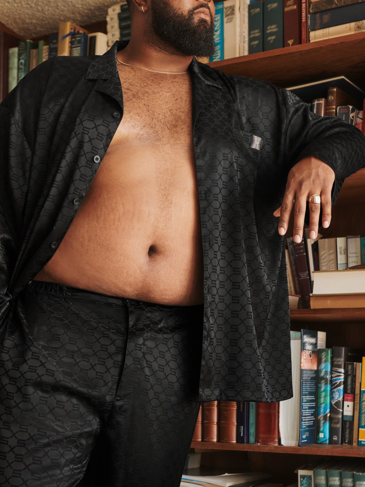 Our Savage X Satin Shirt features an allover print, chest pocket, and button-down front.