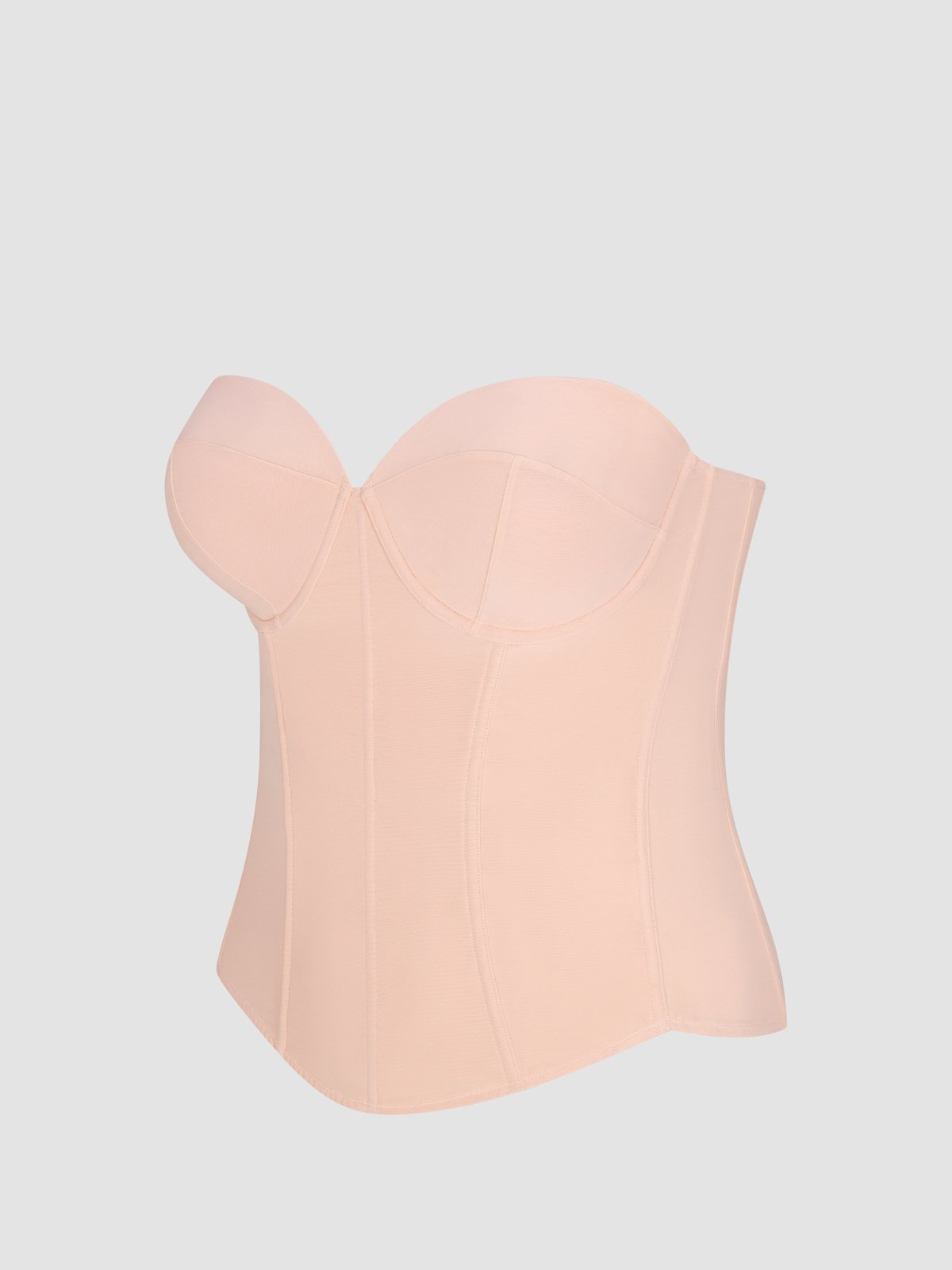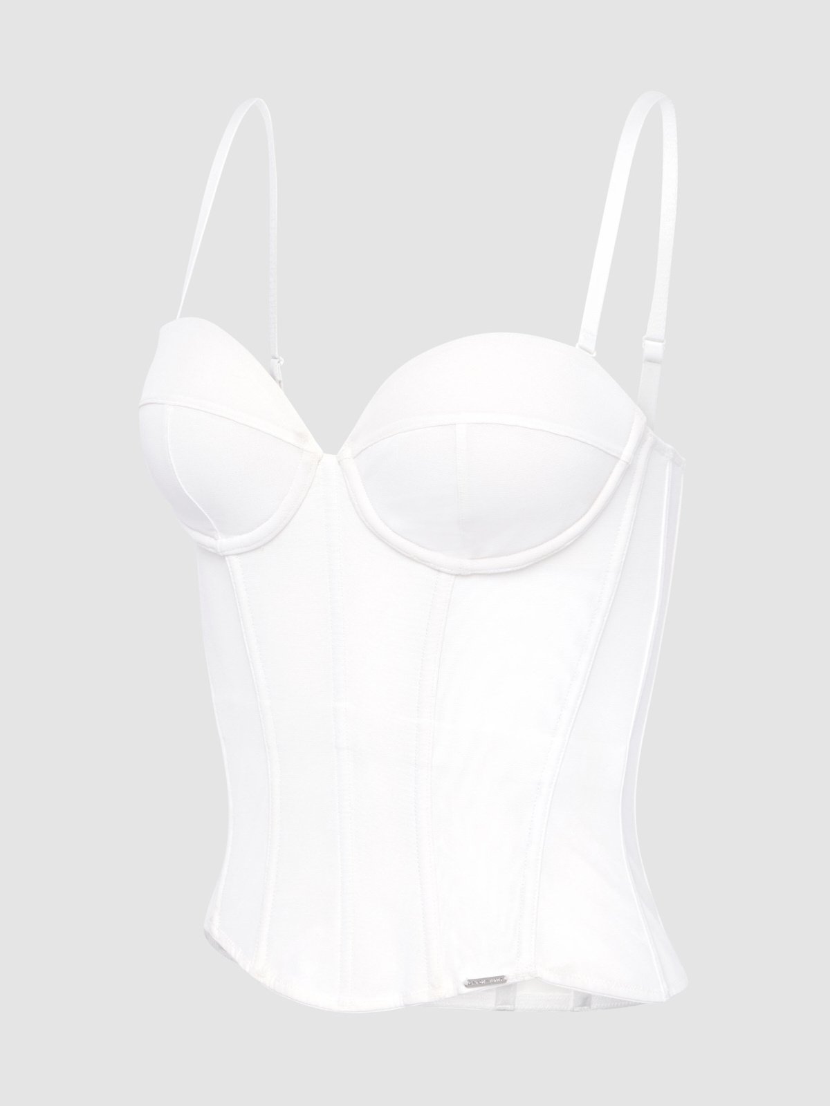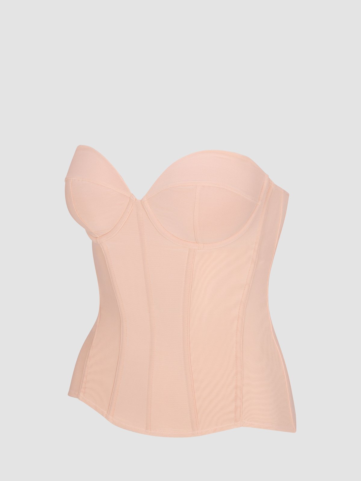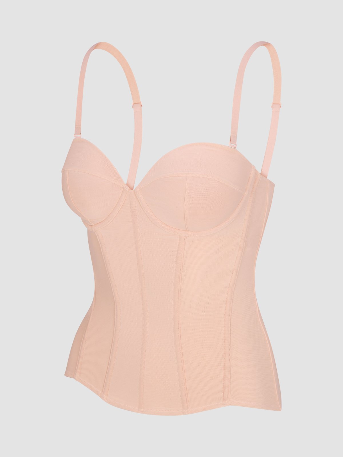Be the center of attention in our Centre Fold Corset, featuring a flattering power-mesh body, supportive underwire, lined balconette cups, and metal boning for shaping. Complete with removable straps for versatile wear and rose gold-tone hardware.