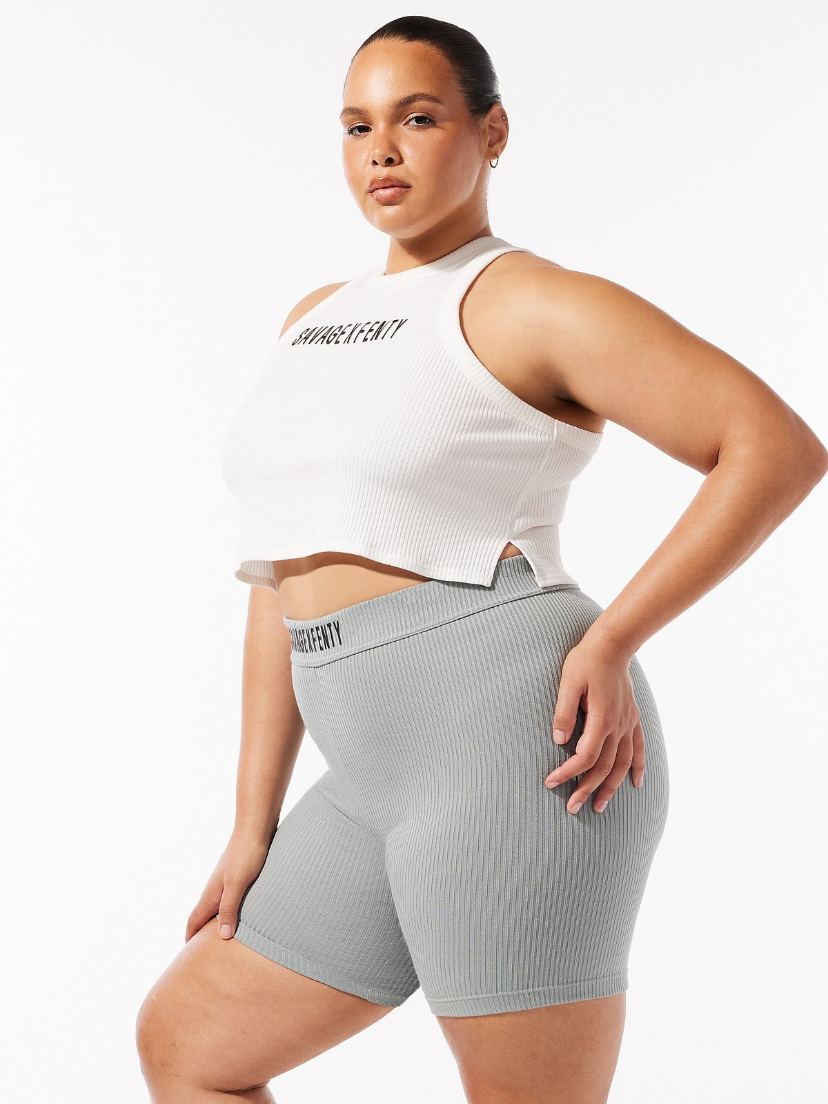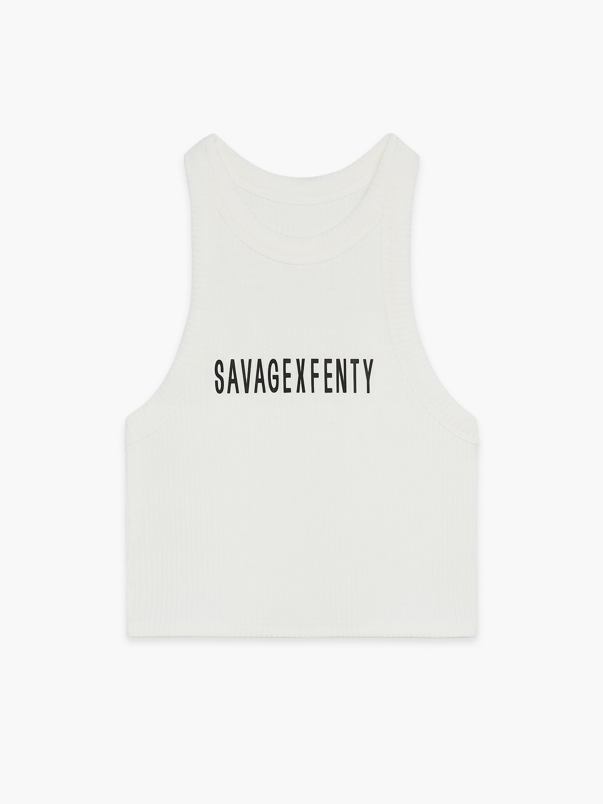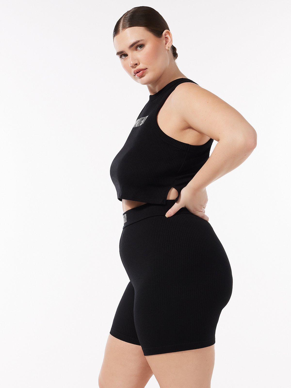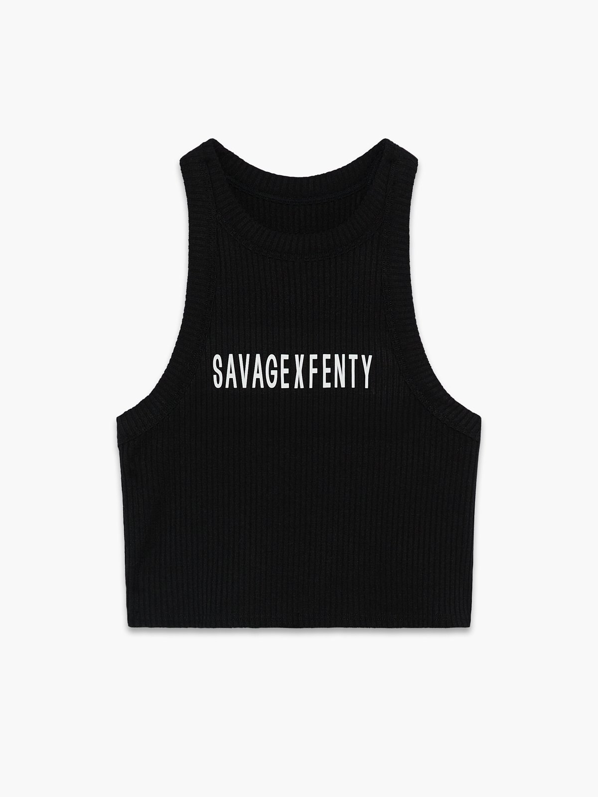 Our Essential Heavy Rib Cropped Logo Tank features a high neckline and vents at side seams.