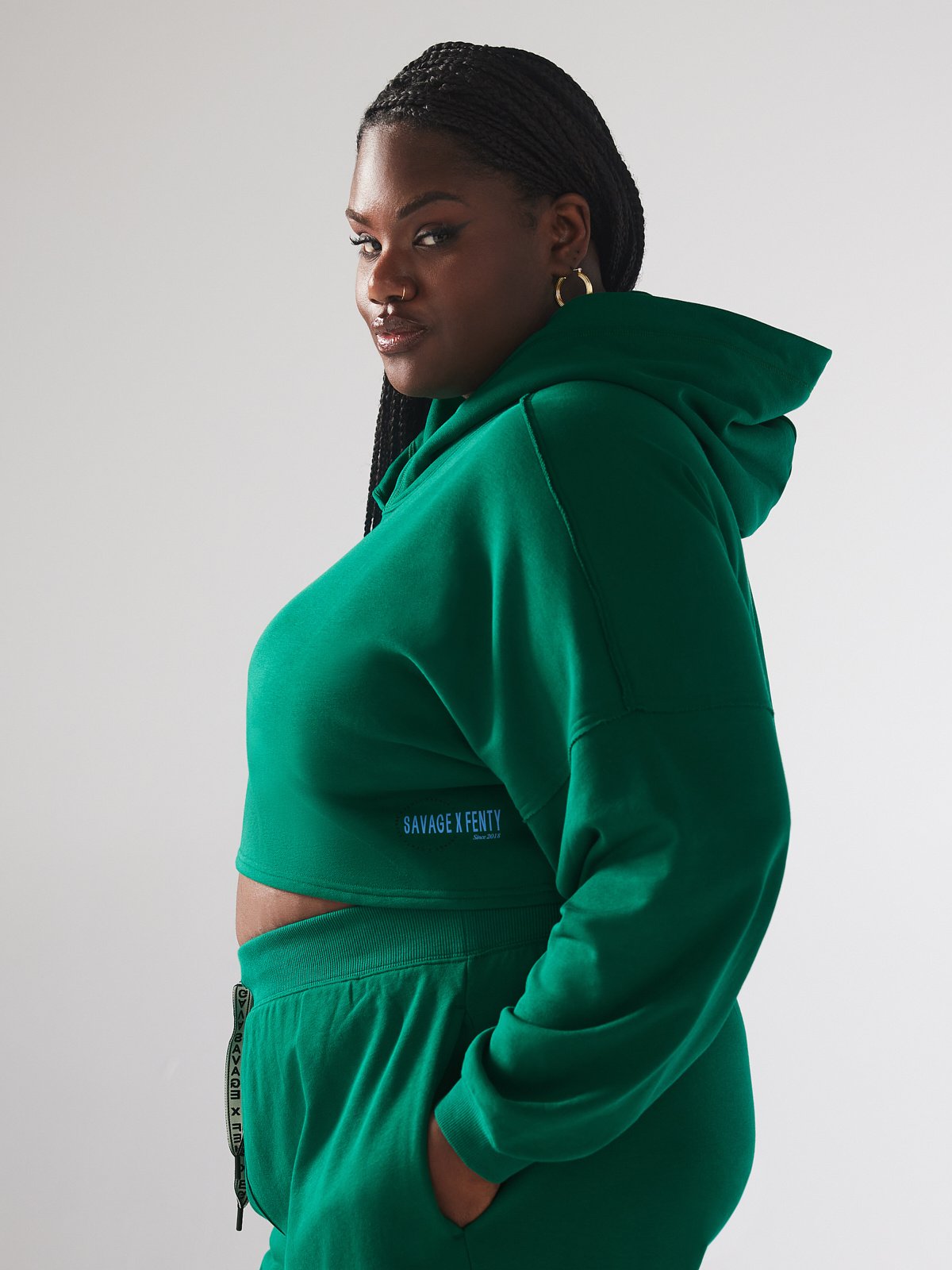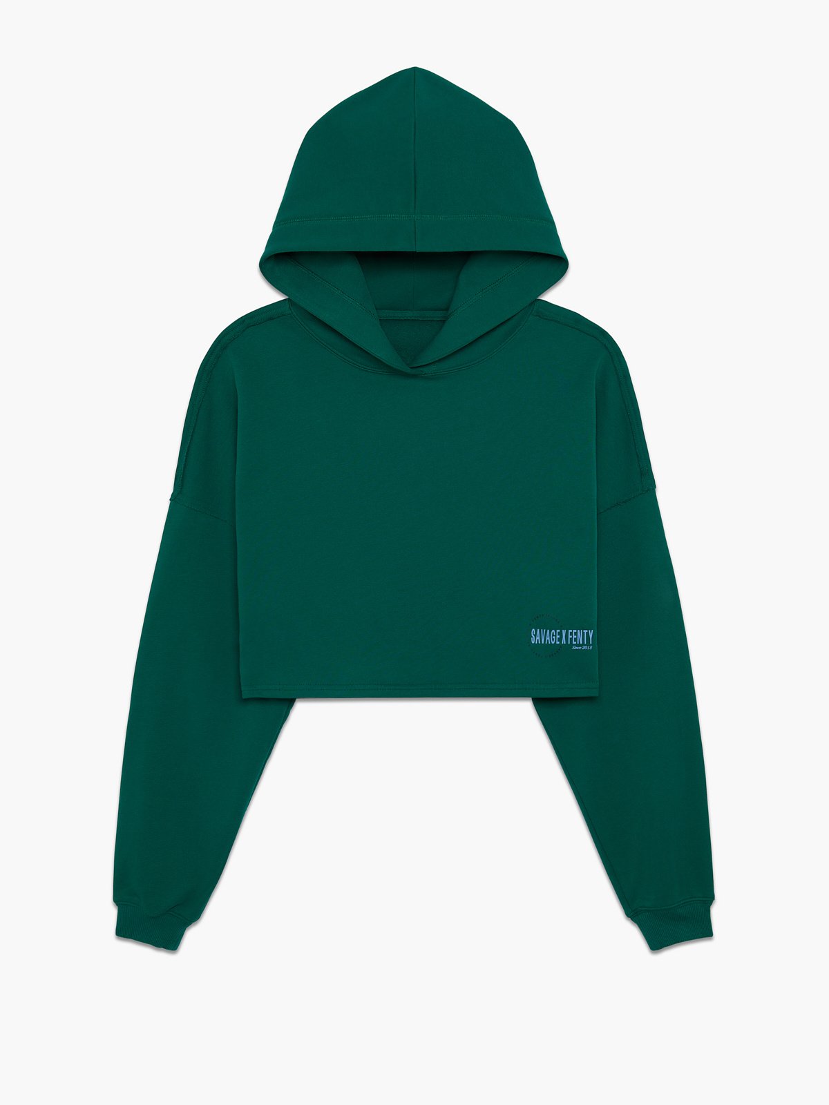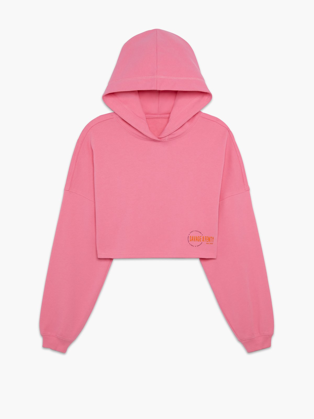 Never miss a beat in our Essential Terry Scope Logo Cropped Hoodie, featuring a dropped shoulder, raw edge details, and a Savage X Fenty graphic on the front hem.
