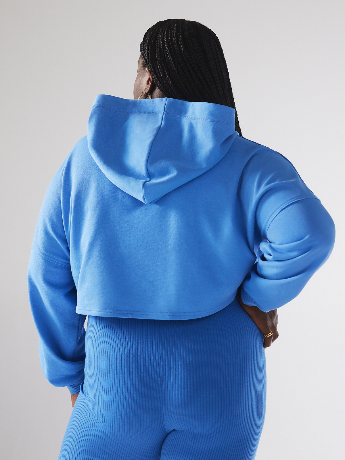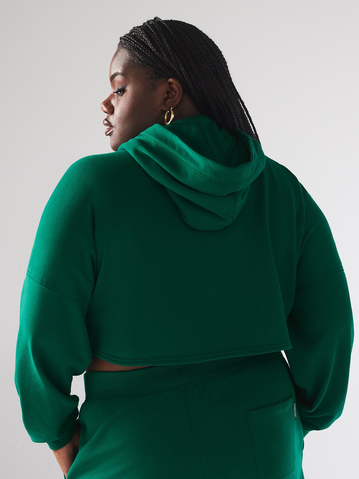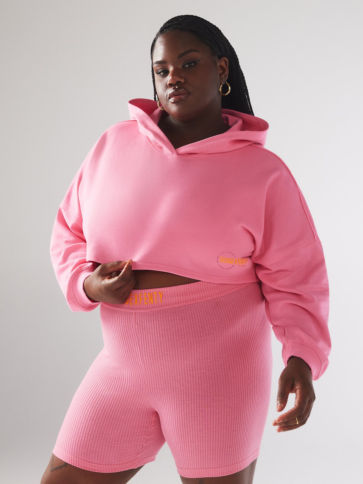 Never miss a beat in our Essential Terry Scope Logo Cropped Hoodie, featuring a dropped shoulder, raw edge details, and a Savage X Fenty graphic on the front hem.