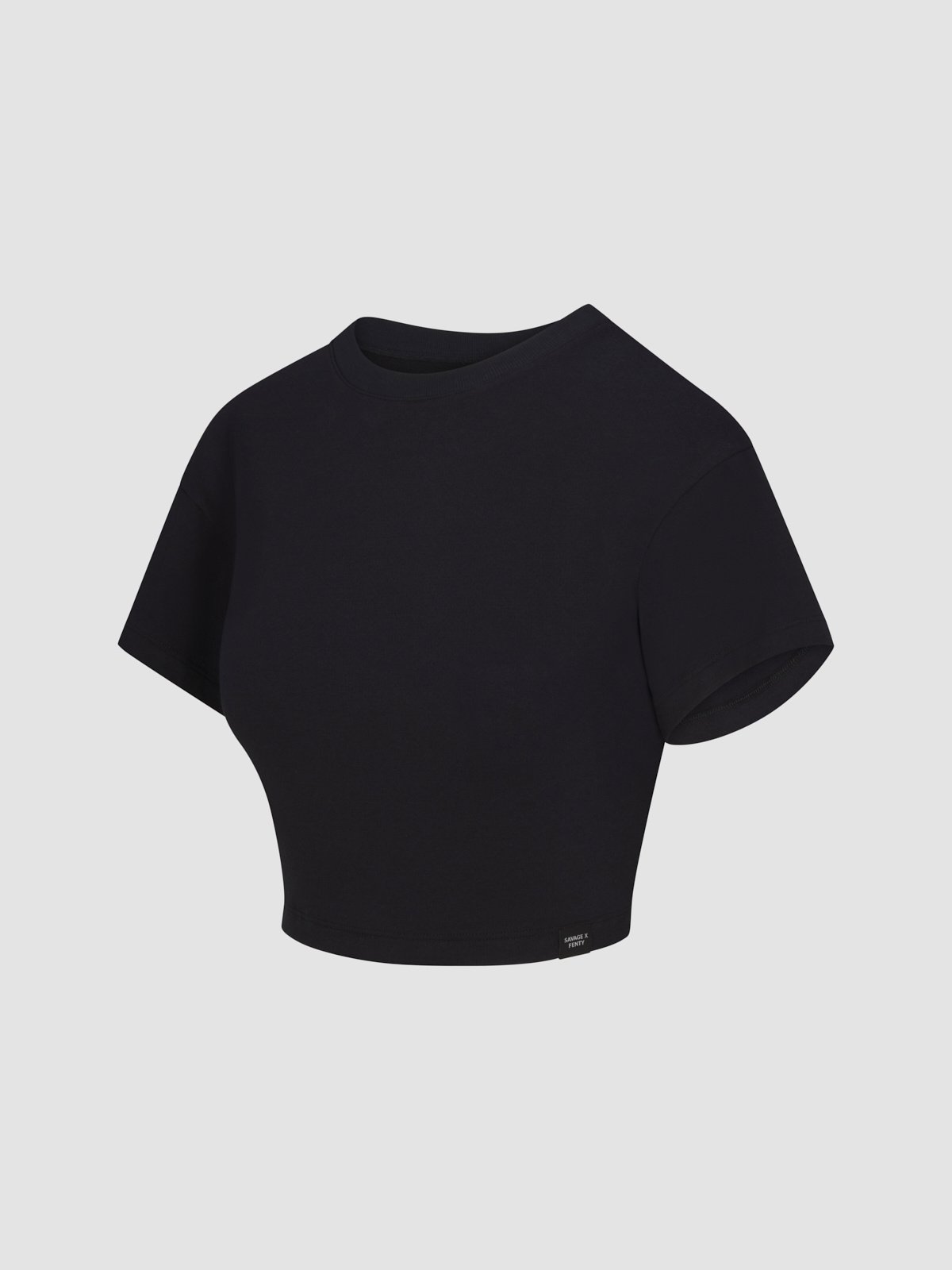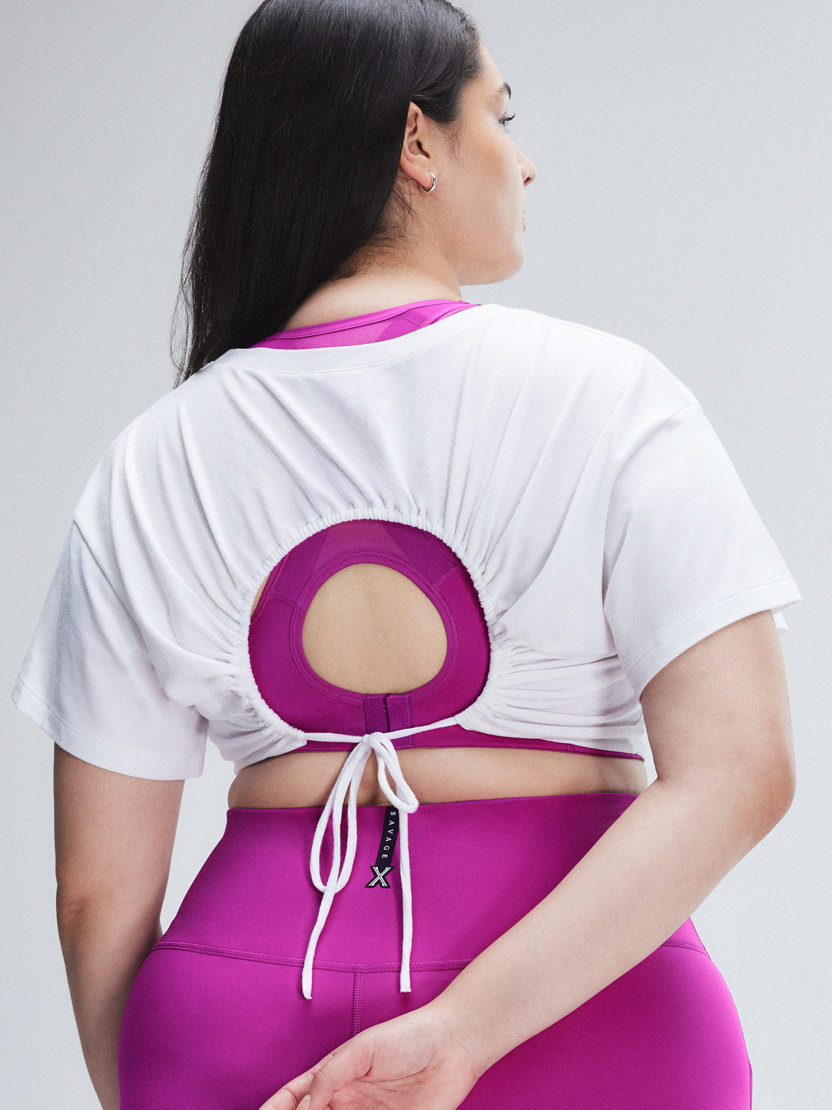 Our Flex On U Cinch-Back Crop Tee is designed with moisture wicking for comfort and made from a soft, jersey fabric. Complete with a back keyhole cutout and ribbed crew neck collar.