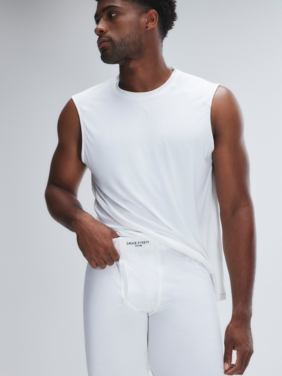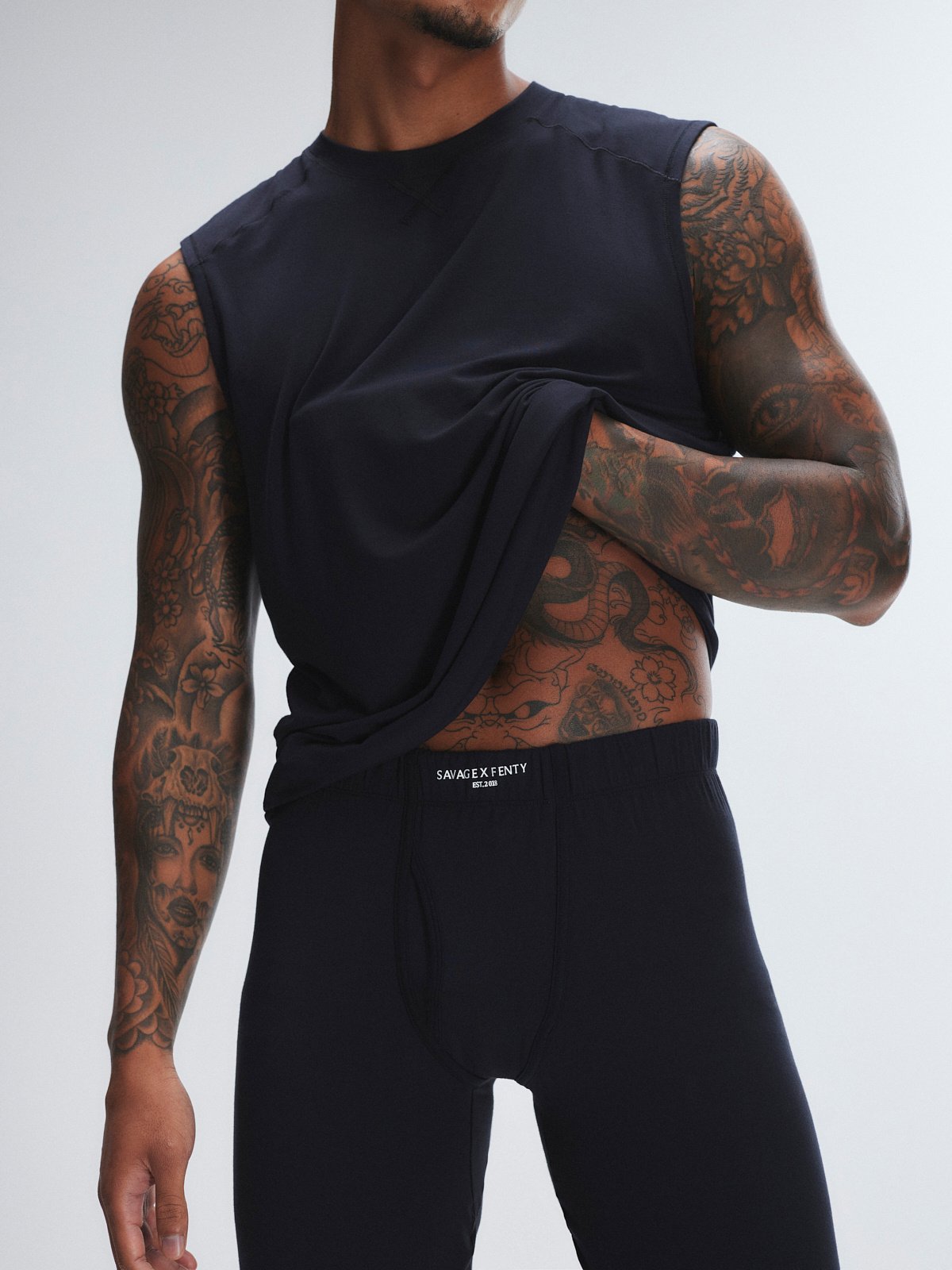 • Heat seal gloss “Savage X Fenty” logo at center-front waistband