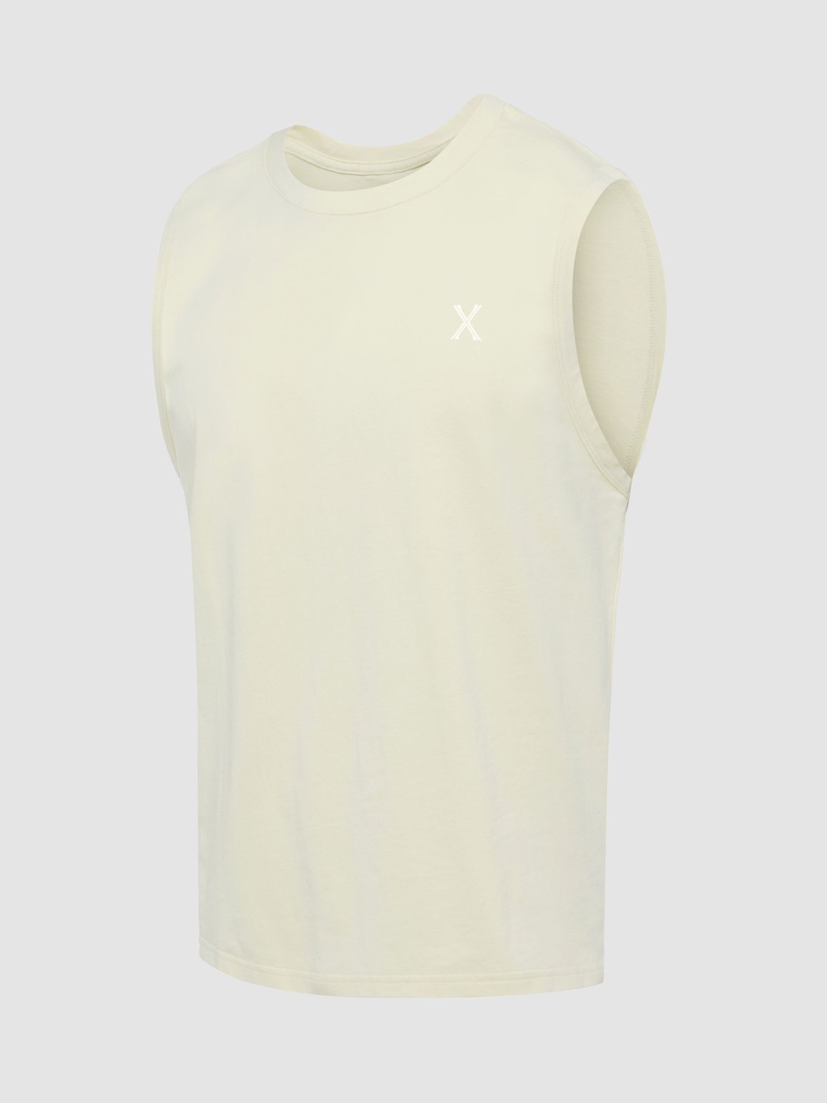 Our Jersey Cut-Off Tee features a heavy jersey design with a relaxed fit, a soft ribbed collar, and dropped armholes.