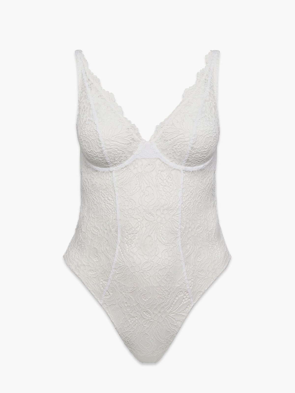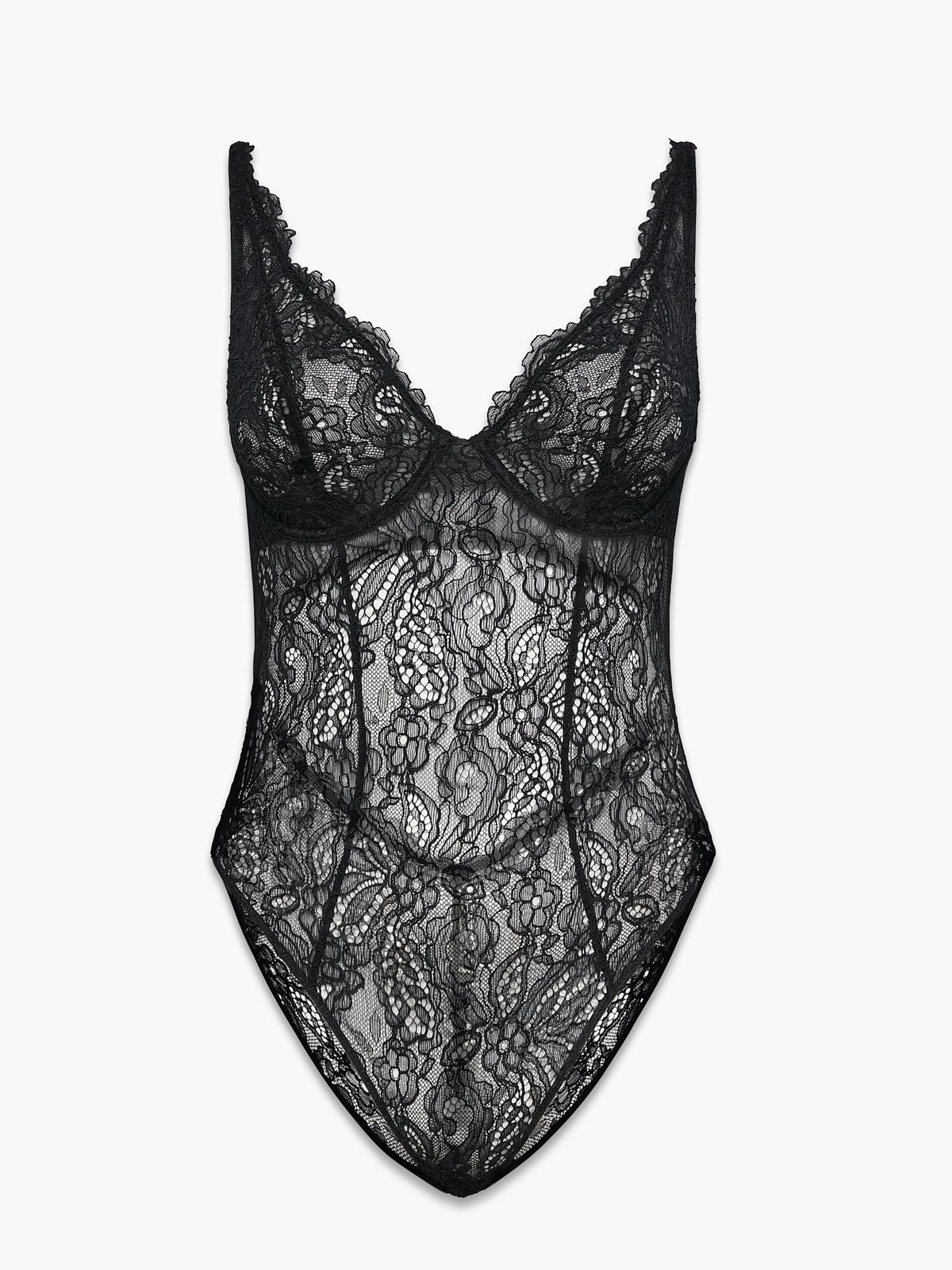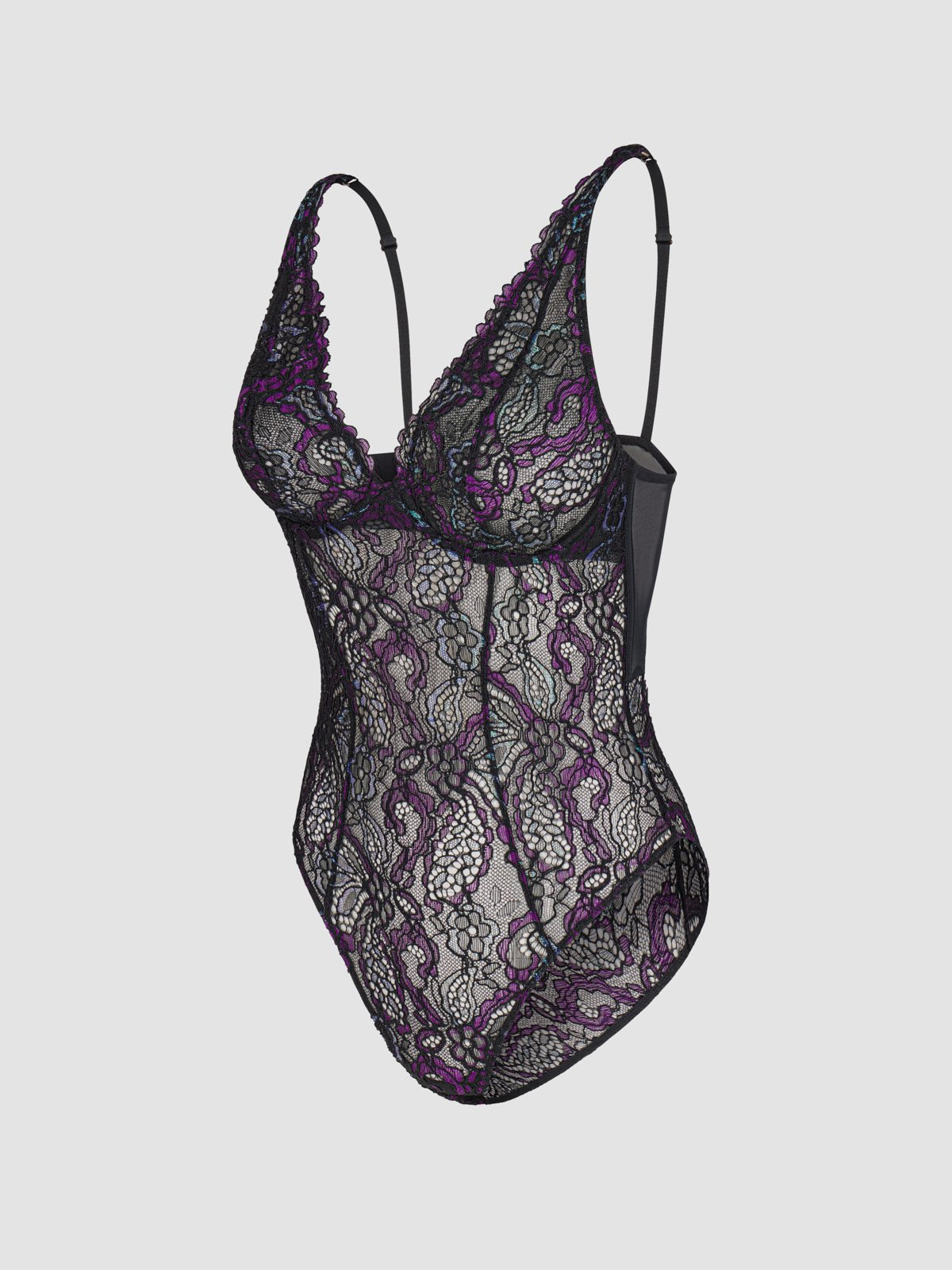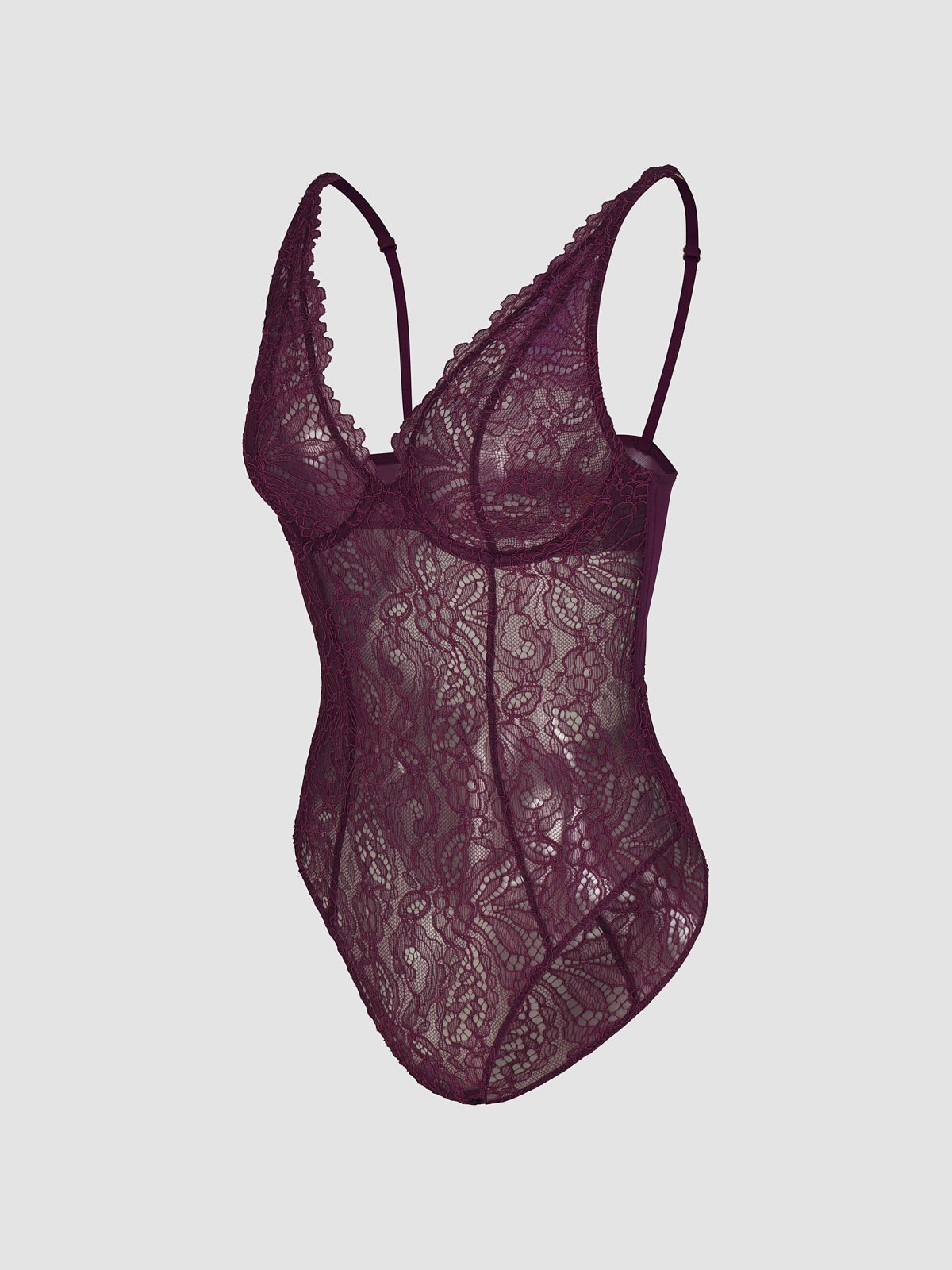 Made from soft, stretch corded lace, our Romantic Corded Lace Underwire Teddy features a plunging neckline, a sexy cutout detail at back, and adjustable straps.
