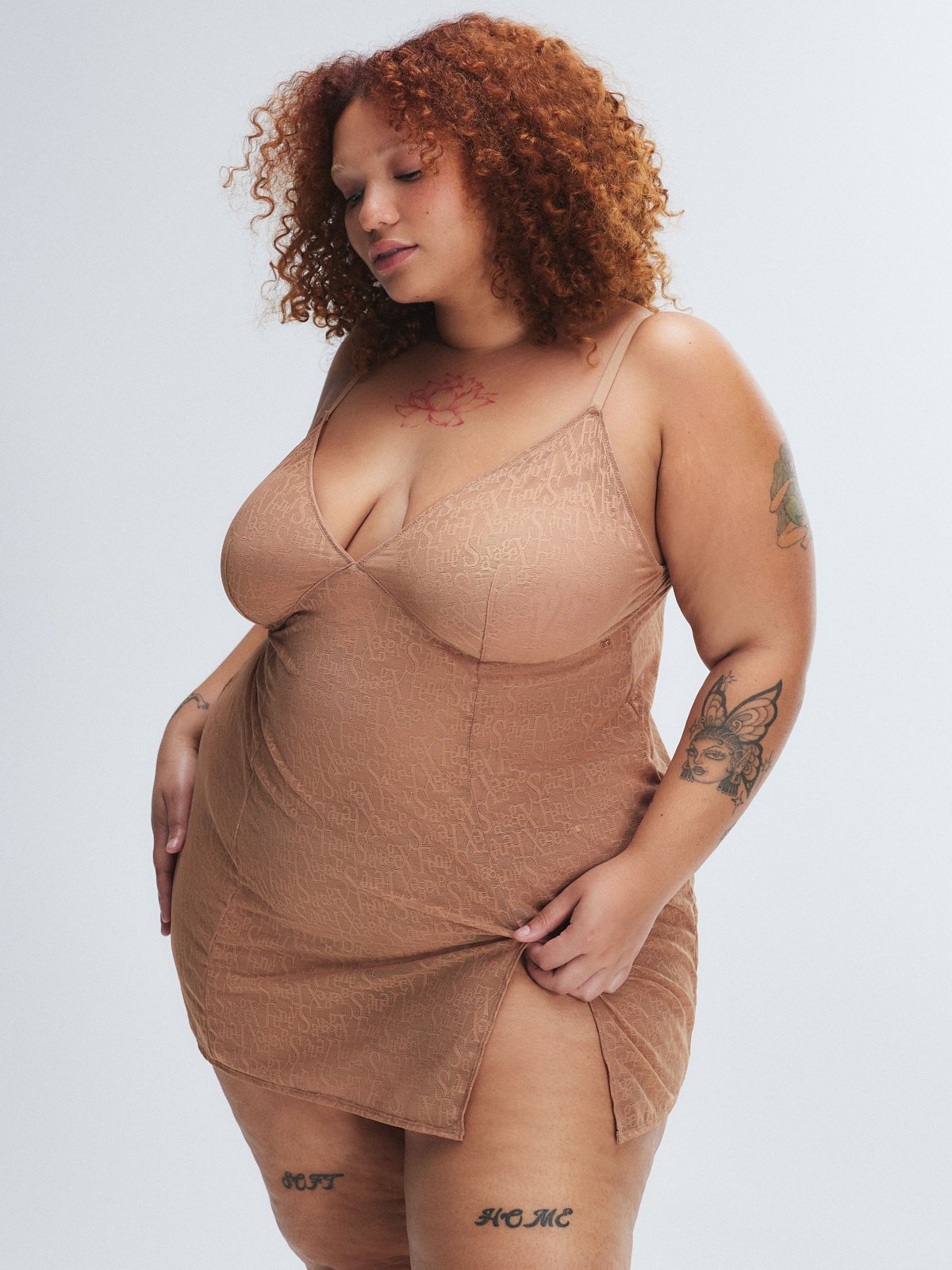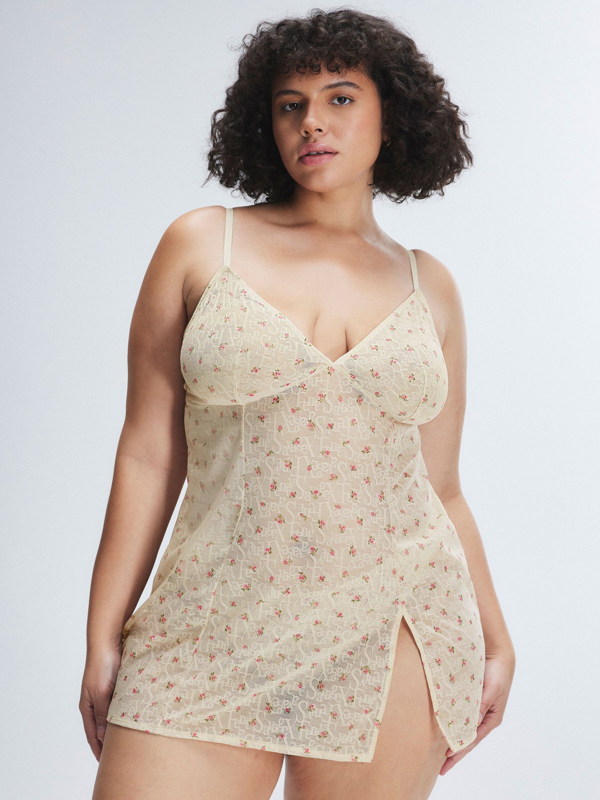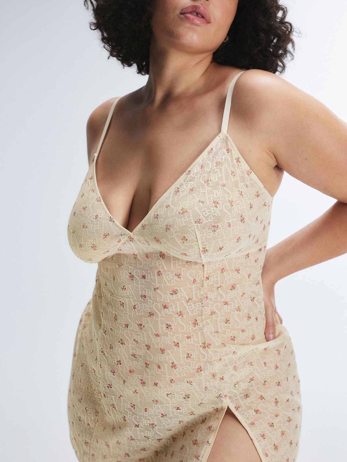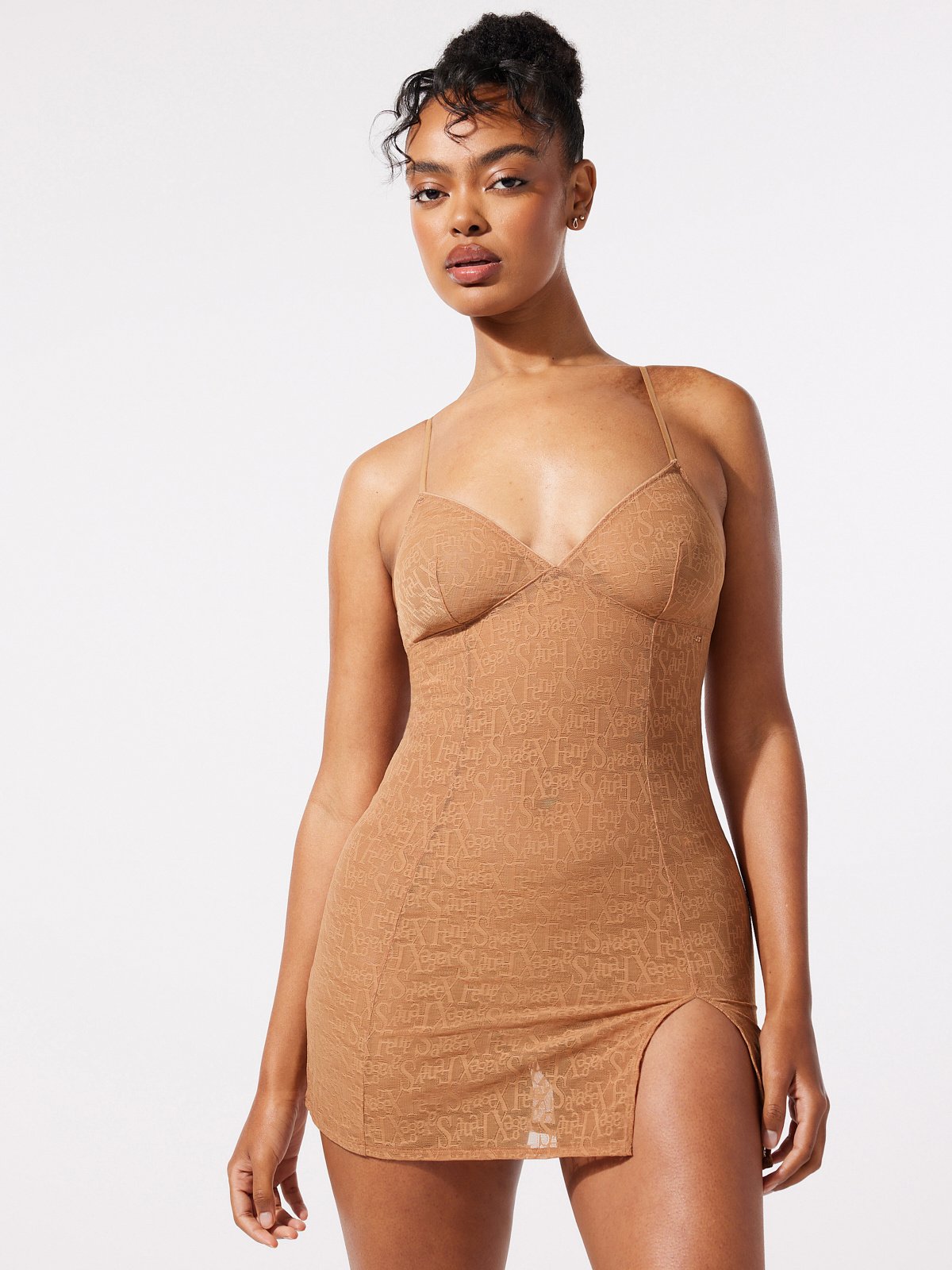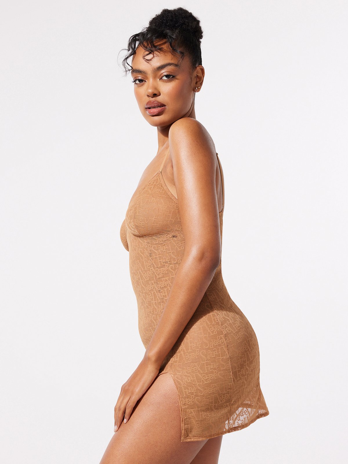 Take things up a notch with our Signature Script Slip, featuring a sheer fabric, logo-lace pattern, and slit on the left side hem.