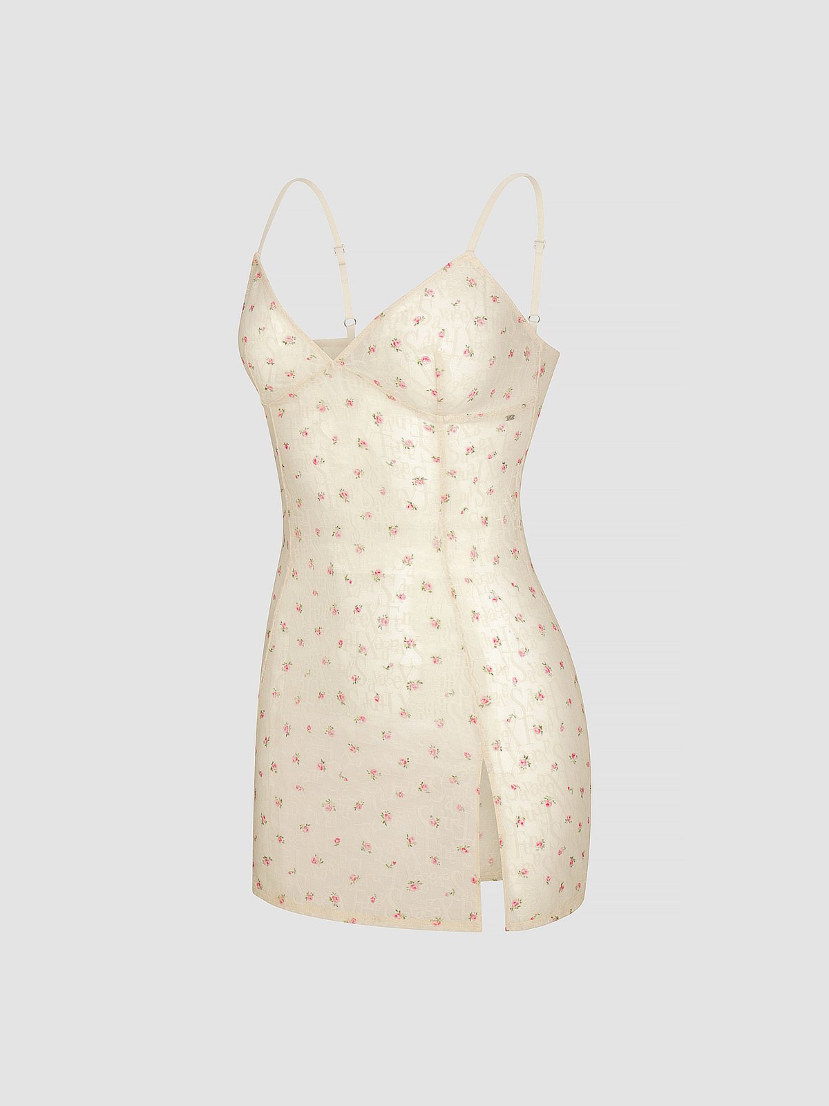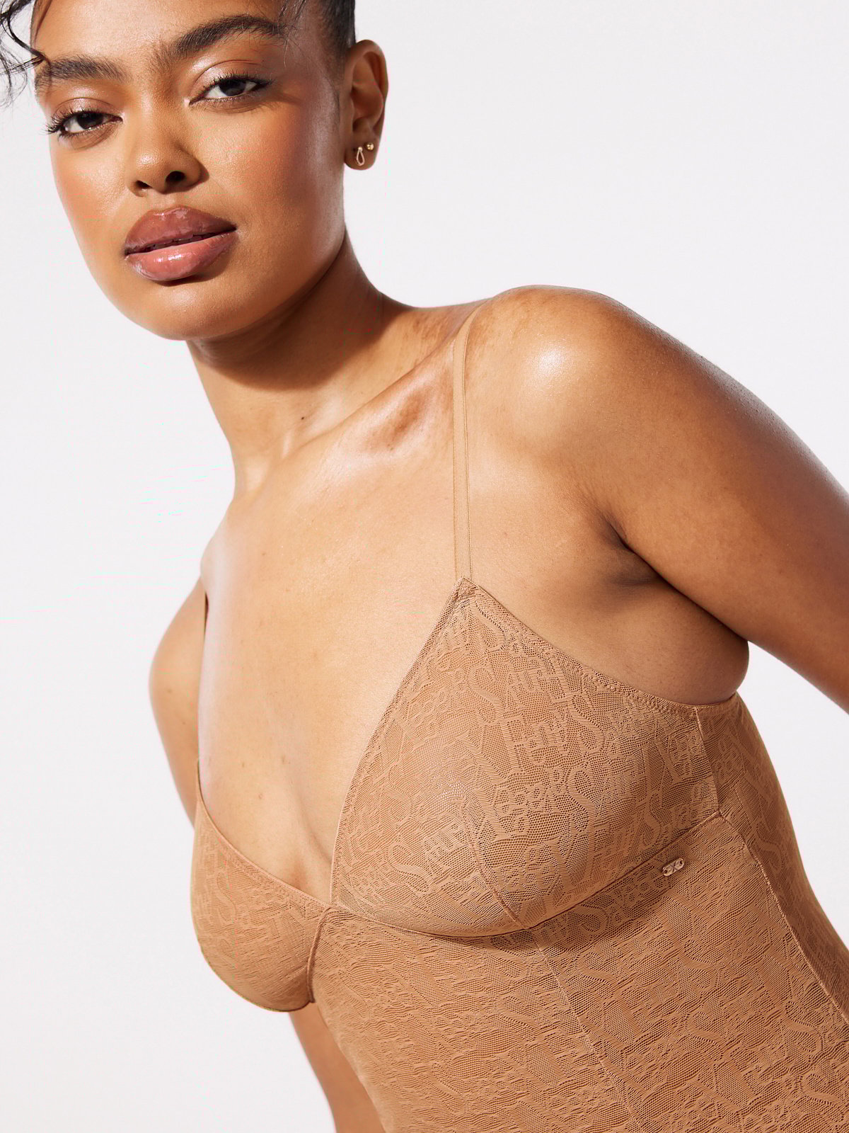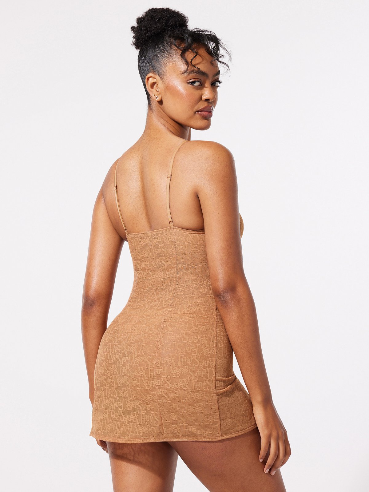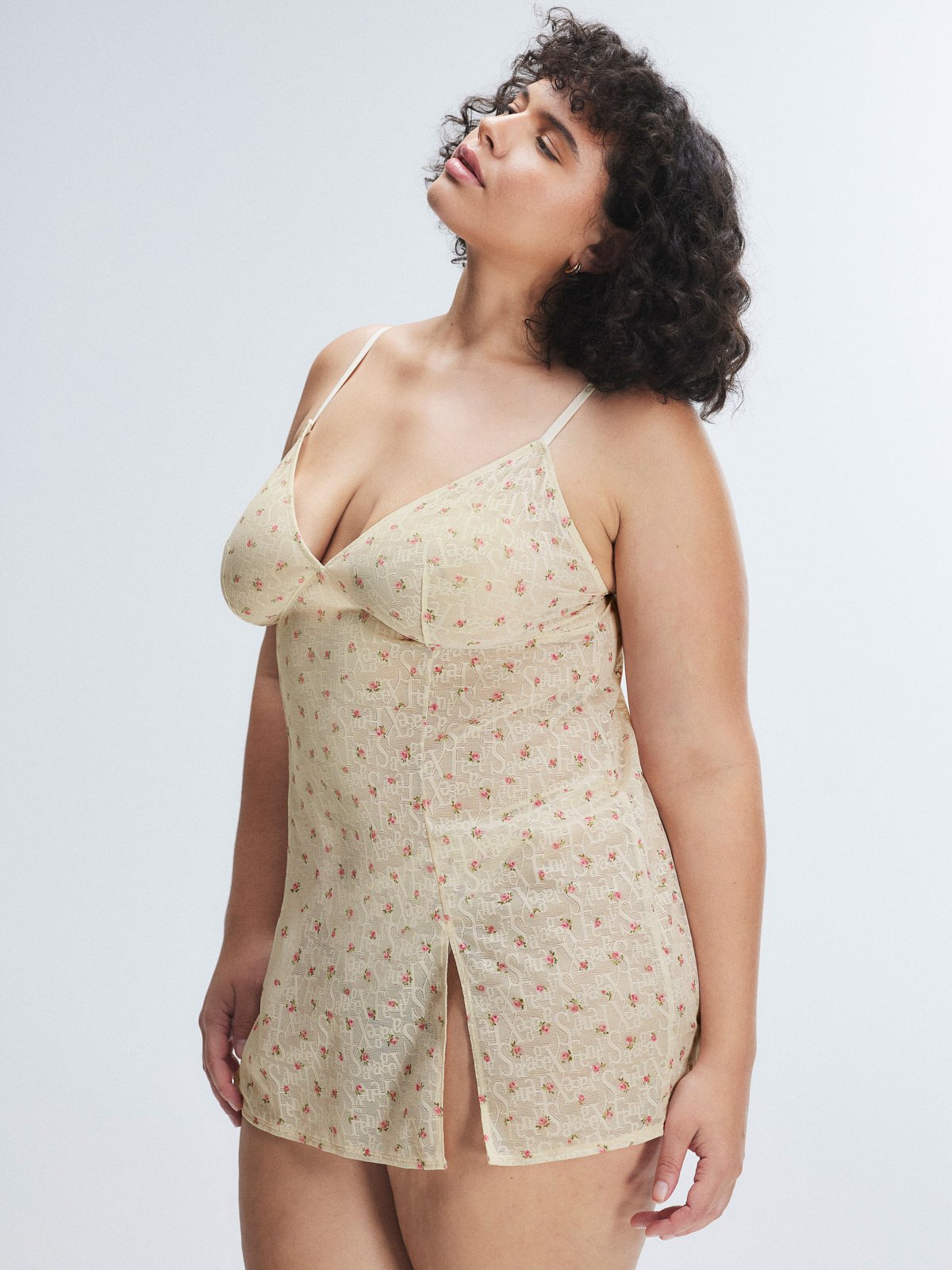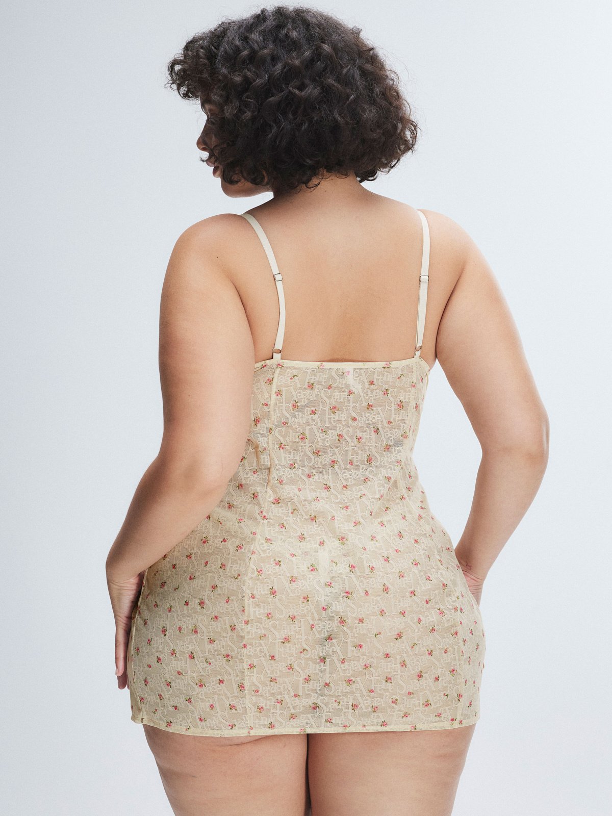 Take things up a notch with our Signature Script Slip, featuring a sheer fabric, logo-lace pattern, and slit on the left side hem.