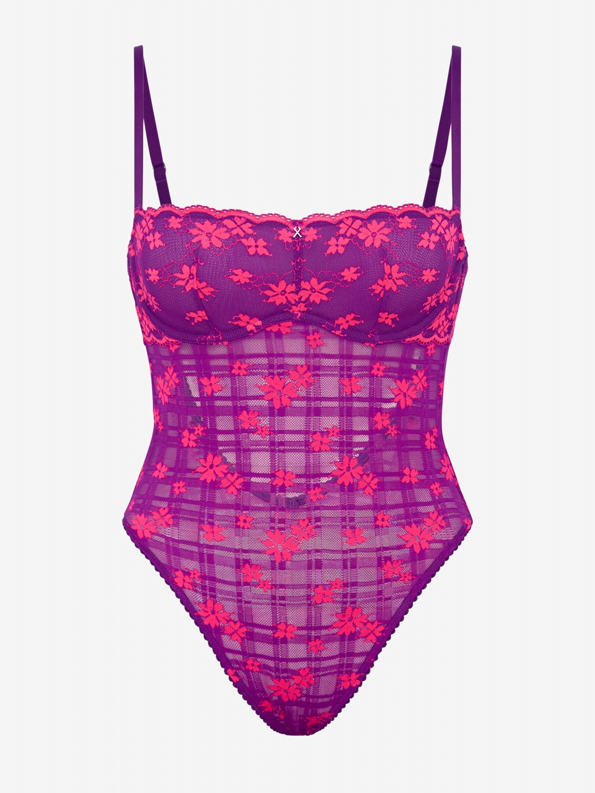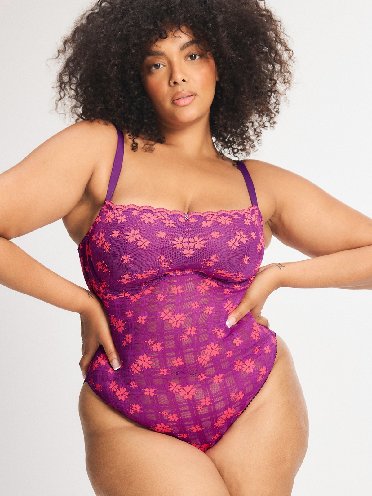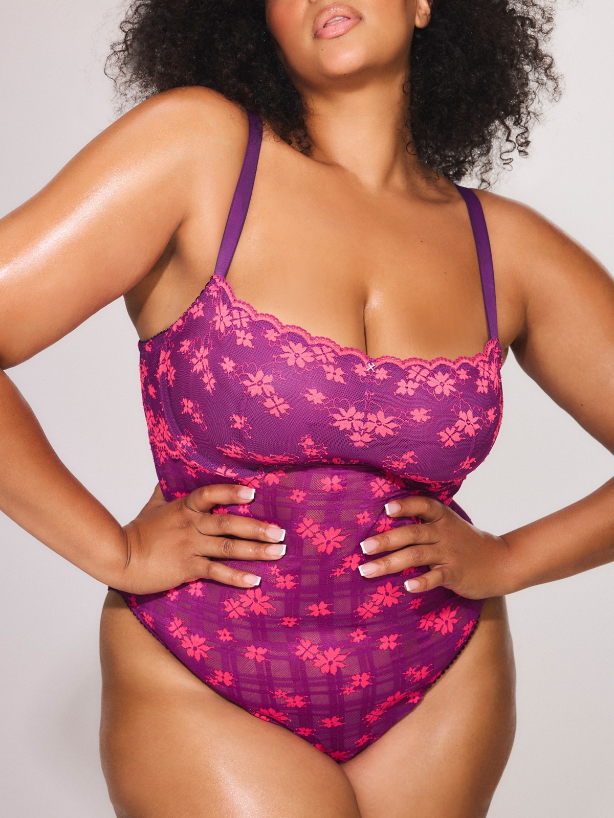 Playing love games is better in our Sweet Tease Lace Teddy. The plaid and floral lace, curve-defining mono-wire, and plunging keyhole back are sure to win anyone over.