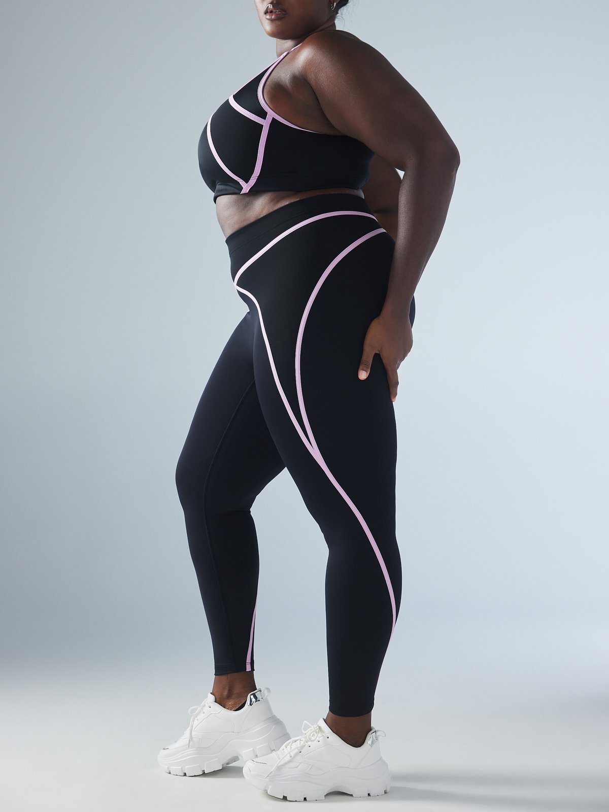 - Curved contrast seaming details down leg line