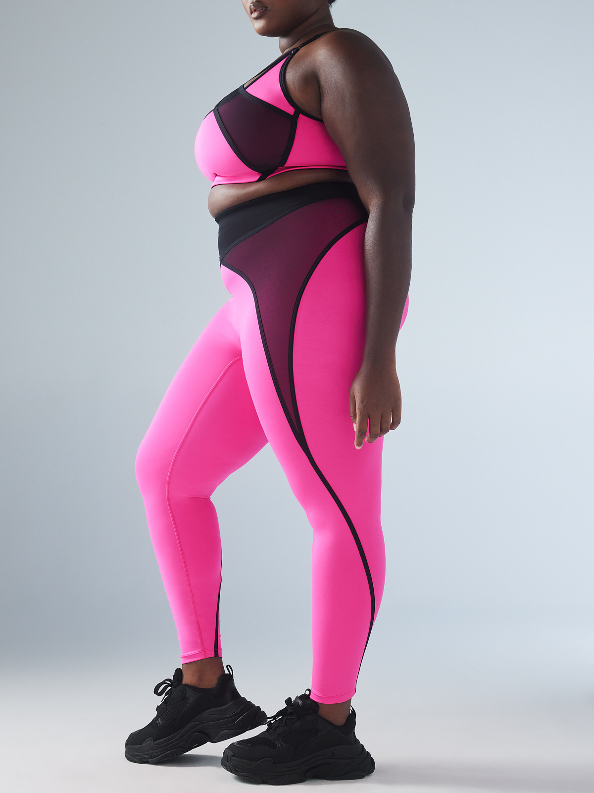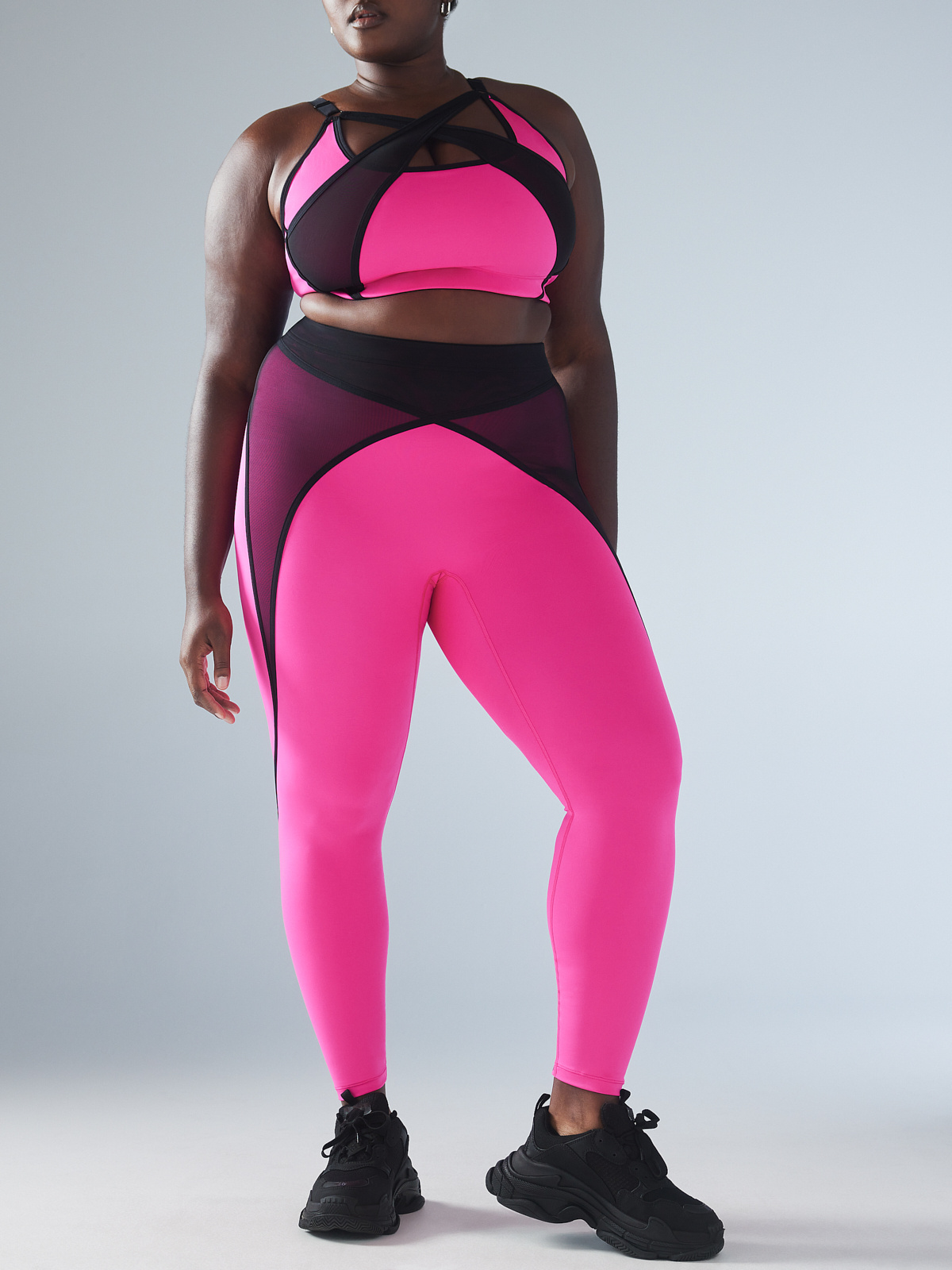 - Mesh overlay panels with contrast binding crisscross at the center-front waist for added support