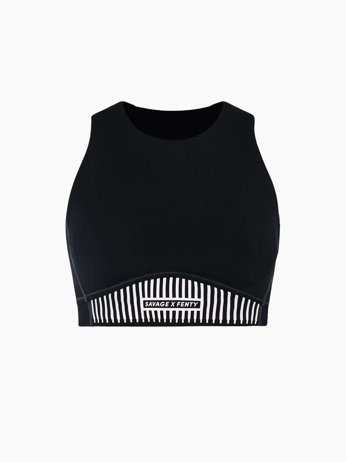 Highlighting your assets, our Xccentuate Medium-Impact Longline Sports Bra is made from a supportive compression fabric and features a high neckline, racerback, and a striped logo panel in front.